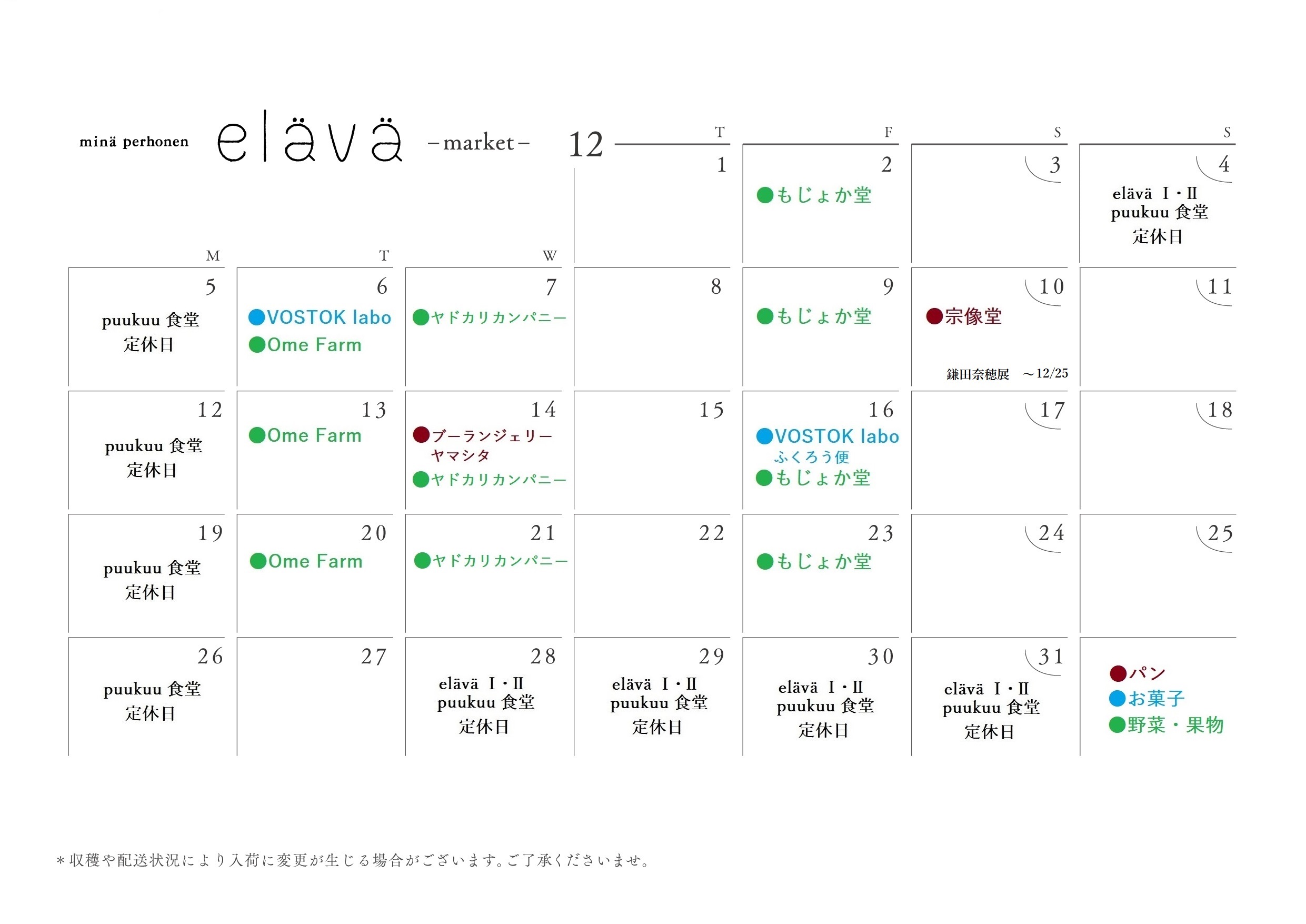 カレンダーを更新した際は、eläväのインスタグラムにてお知らせいたします。elävä Ⅰのマーケットカレンダー 12月