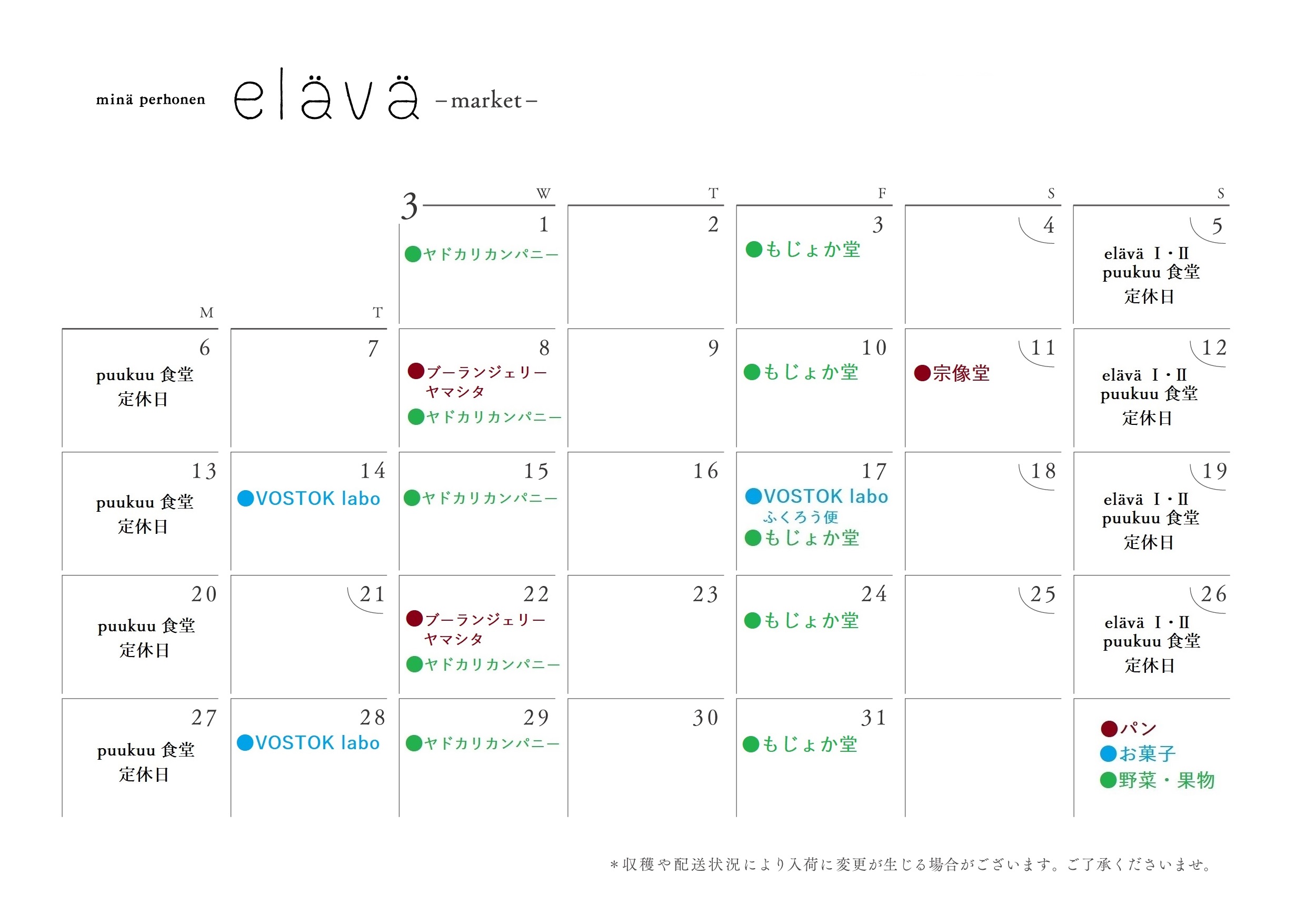 詳細につきましては、eläväショップまでお問合せください。elävä Ⅰのマーケットカレンダー 3月