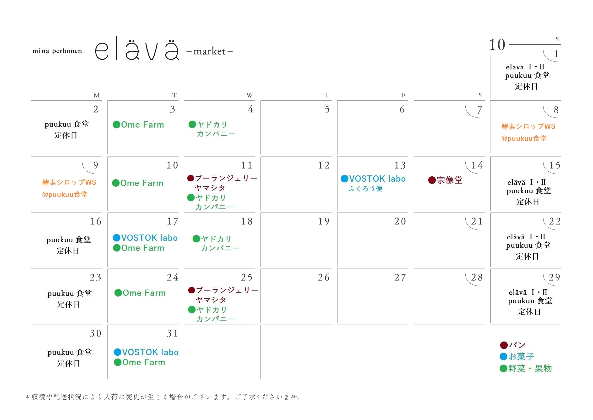 詳細につきましては、eläväショップまでお問い合わせください。elävä Ⅰのマーケットカレンダー 10月