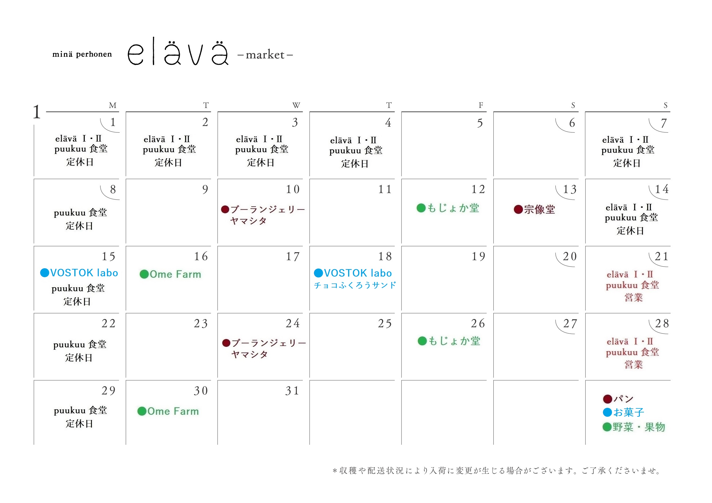 詳細につきましては、eläväショップまでお問い合わせください。elävä Ⅰのマーケットカレンダー 1月