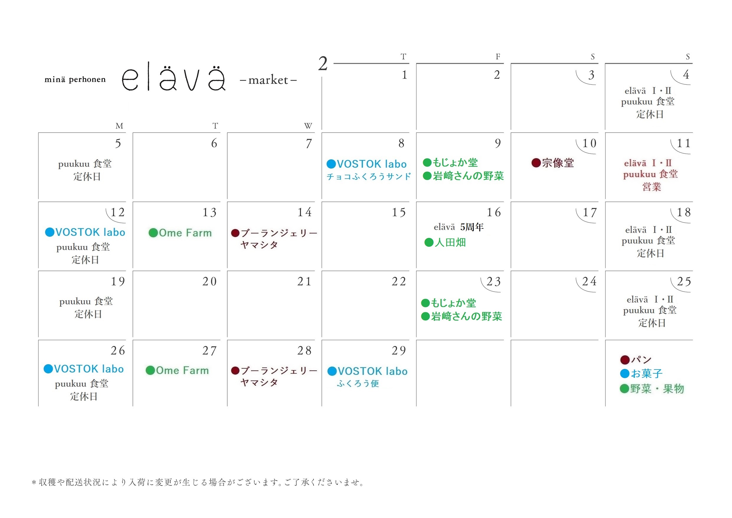 詳細につきましては、eläväショップまでお問い合わせください。elävä Ⅰのマーケットカレンダー 2月