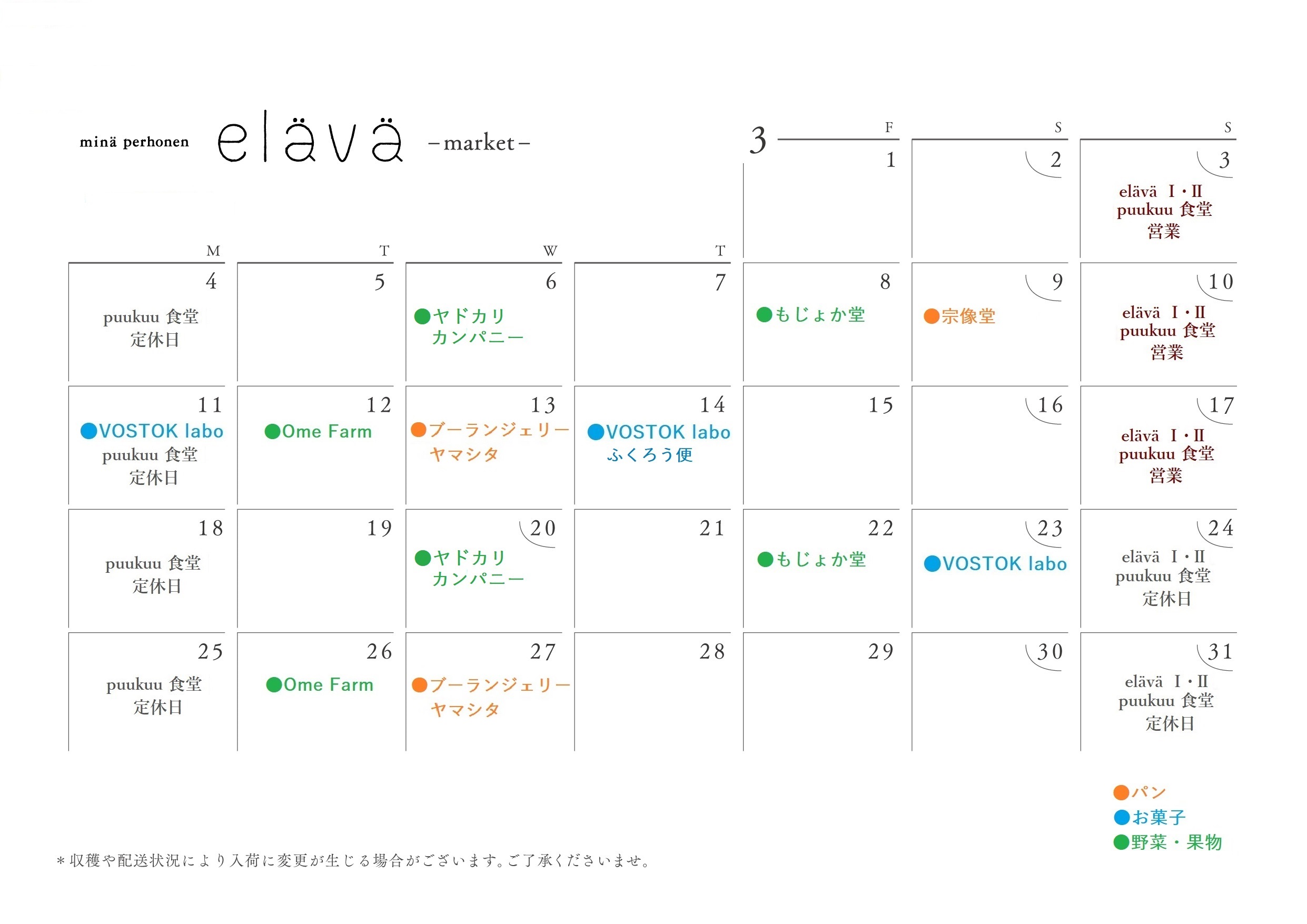 入荷情報については、以下のカレンダーをご覧ください。カレンダーを更新した際は、eläväのインスタグラムにてお知らせいたします。