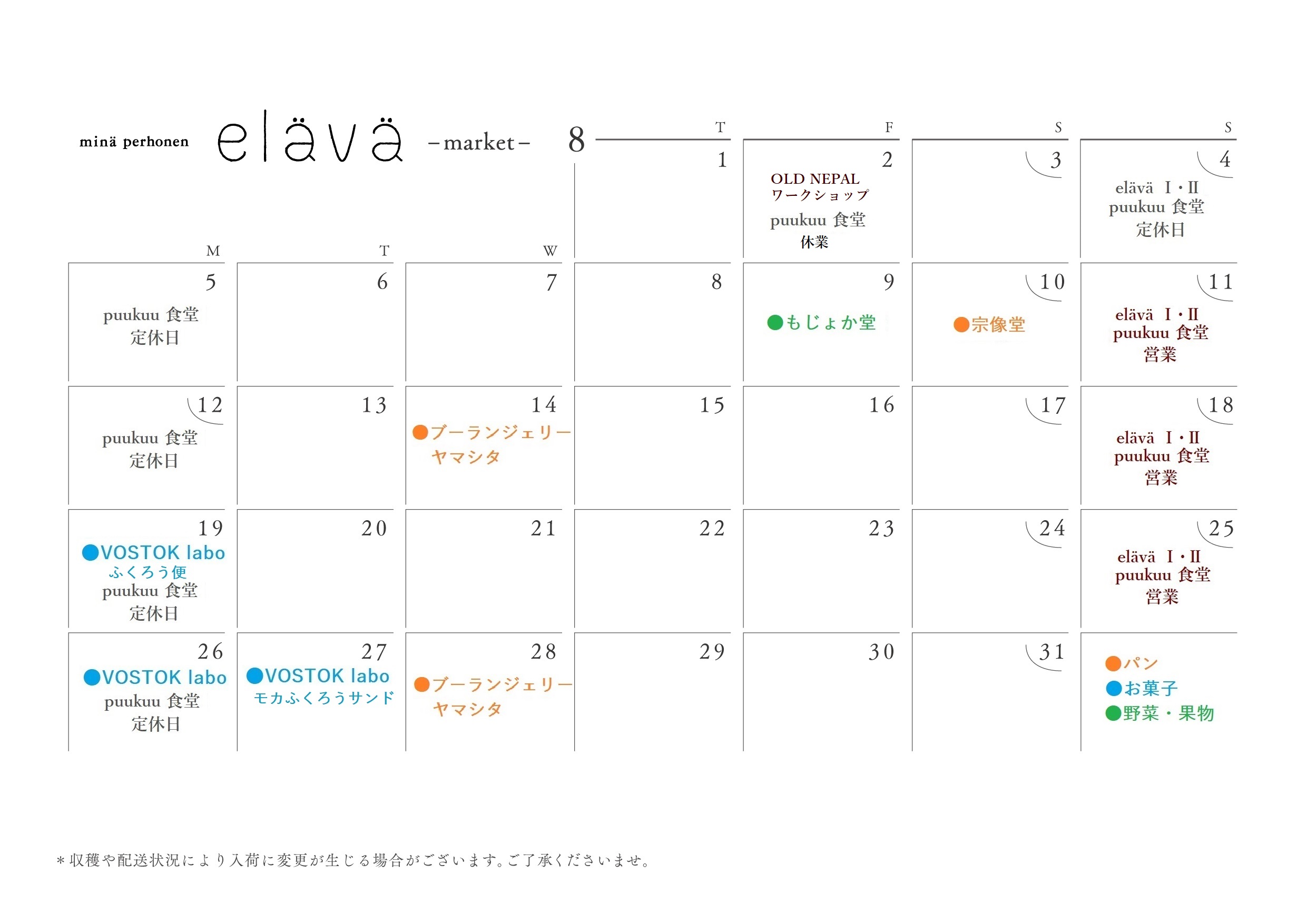 2024.7.30 elävä Ⅰのマーケットカレンダー 8月
