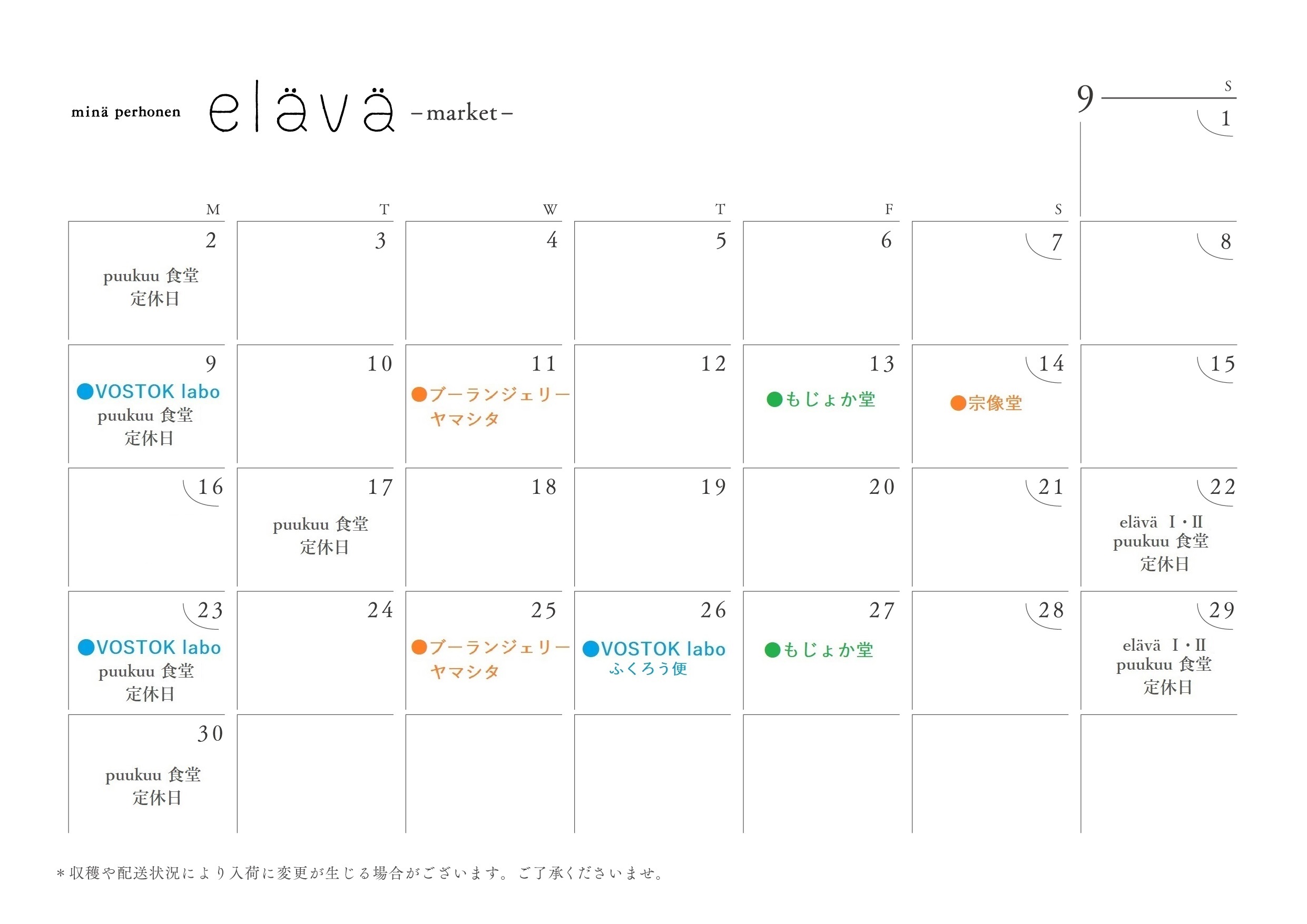 詳細につきましては、eläväショップまでお問い合わせください。elävä Ⅰのマーケットカレンダー 9月