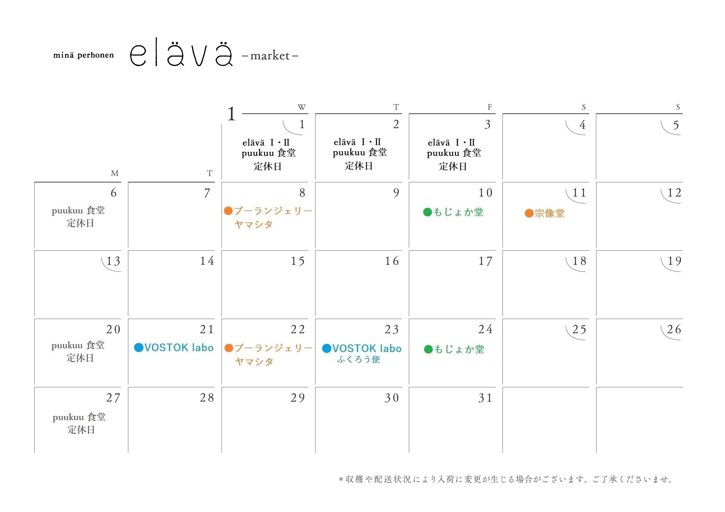 詳細につきましては、eläväショップまでお問い合わせください。elävä Ⅰのマーケットカレンダー 1月
