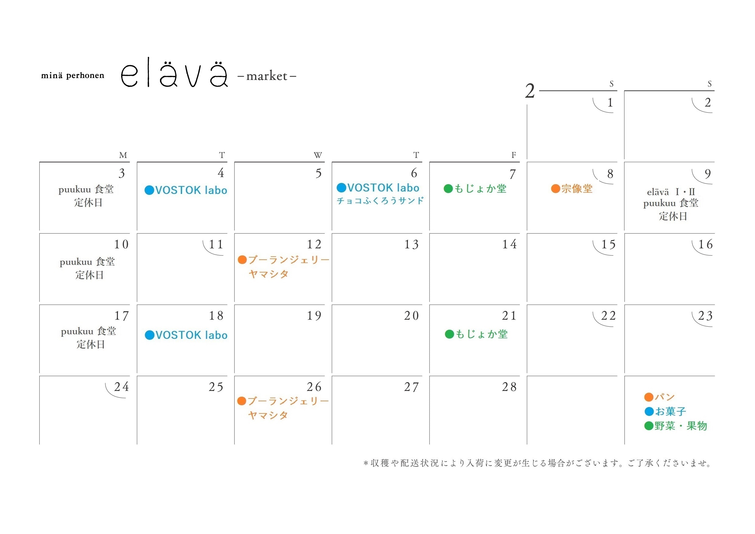 詳細につきましては、eläväショップまでお問い合わせください。elävä Ⅰのマーケットカレンダー 2月