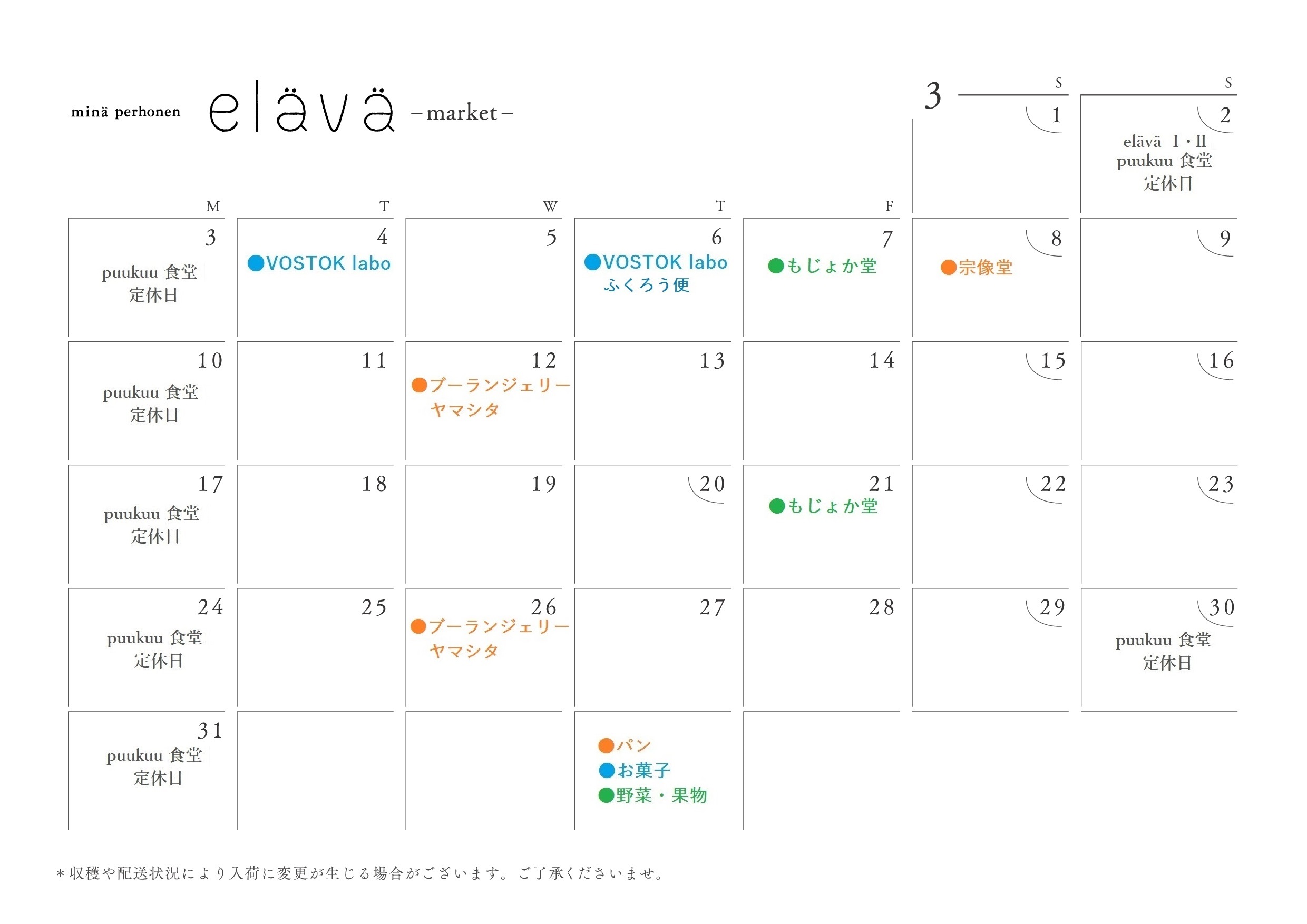 詳細につきましては、eläväショップまでお問い合わせください。elävä Ⅰのマーケットカレンダー 3月