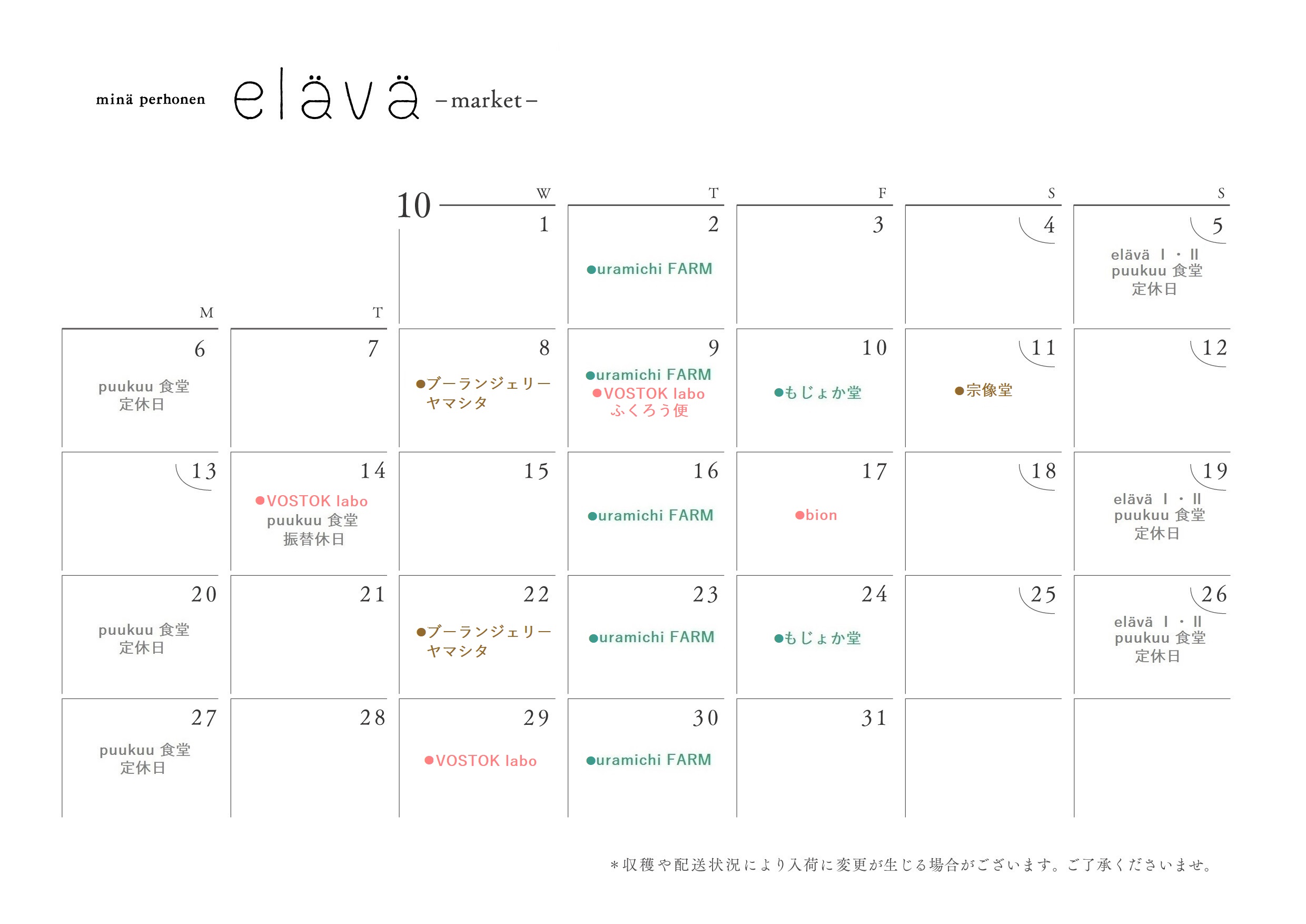 詳細につきましては、eläväショップまでお問い合わせください。elävä Ⅰのマーケットカレンダー 10月