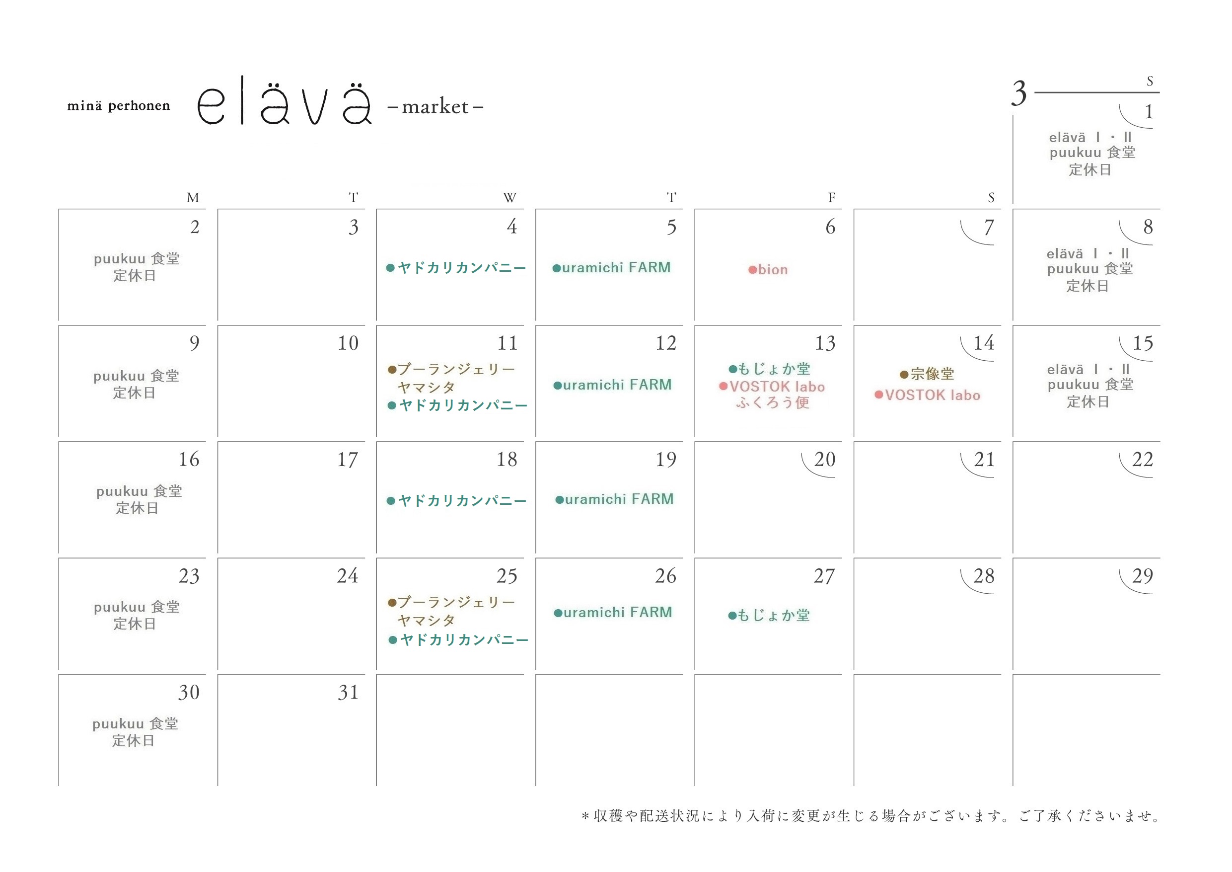 詳細につきましては、eläväショップまでお問い合わせください。elävä Ⅰのマーケットカレンダー 3月