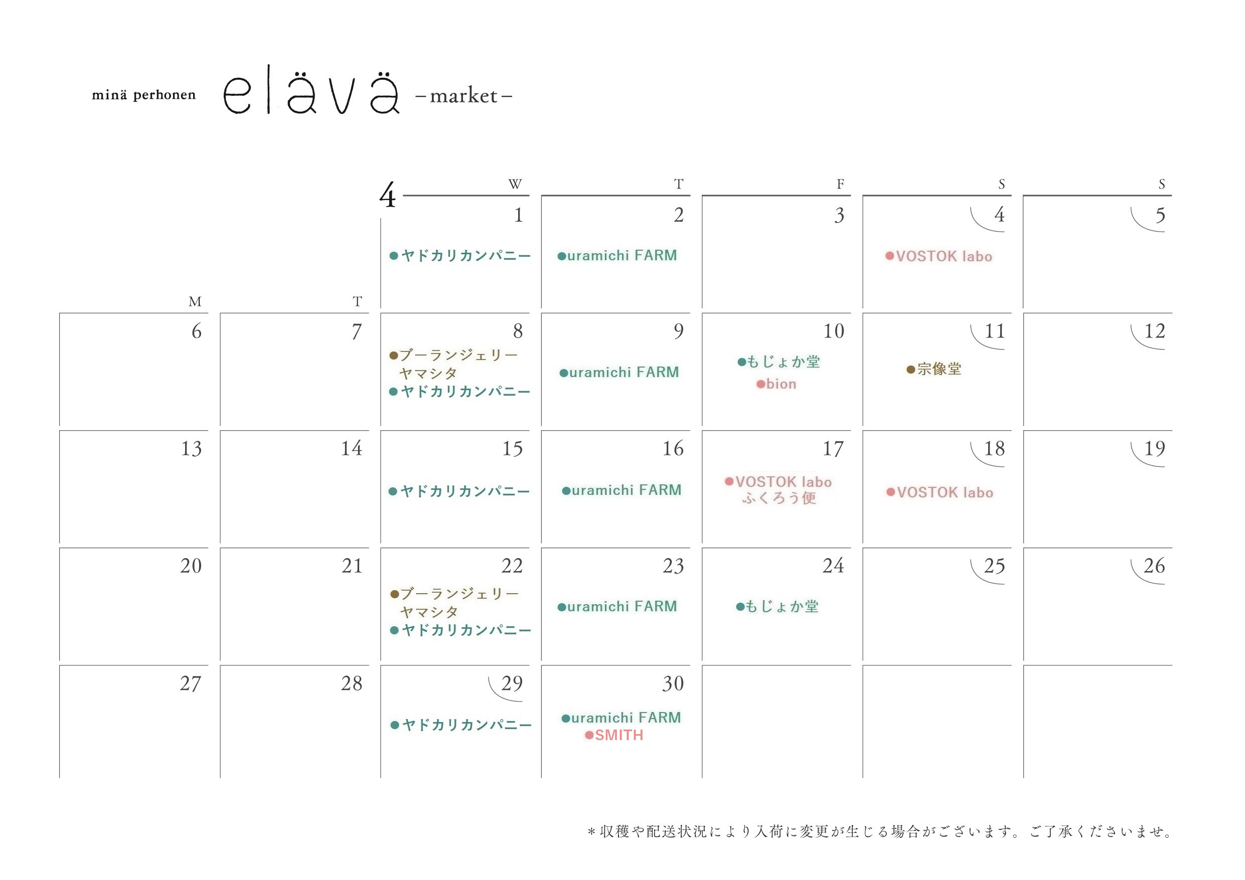 入荷情報については、以下のカレンダーをご覧ください。カレンダーを更新した際は、eläväのインスタグラムにてお知らせいたします。