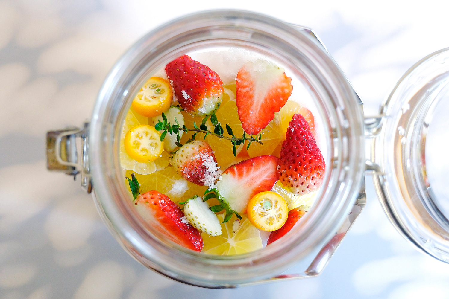 春らしい見た目にも華やかな苺と柑橘、ハーブやお花を使った酵素シロップづくりを杉本雅代さんに教わります。