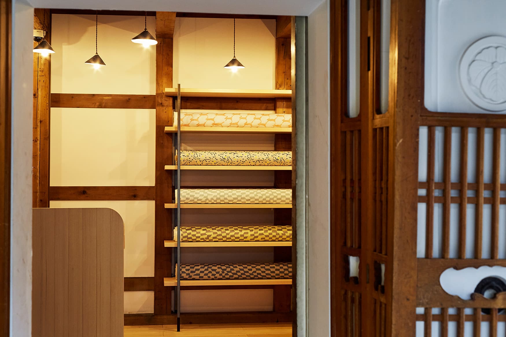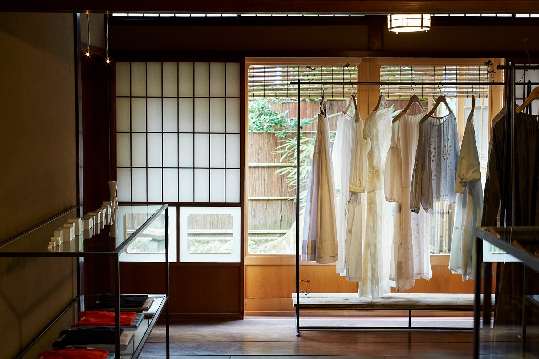閑静な住宅街にある金沢店は、大正時代に建てられた日本家屋から生まれました。母屋と二つの蔵をつないでひとつの空間に仕上げ、ほんのり翳りある佇まいはそのままに、革の床に始まるフロアには、洋服(Women's、Men's、Petit)、インテリアファブリックや家具、それに国内外の工芸やビンテージアイテムなども配して様々なミナ ペルホネンの姿をご紹介しています。